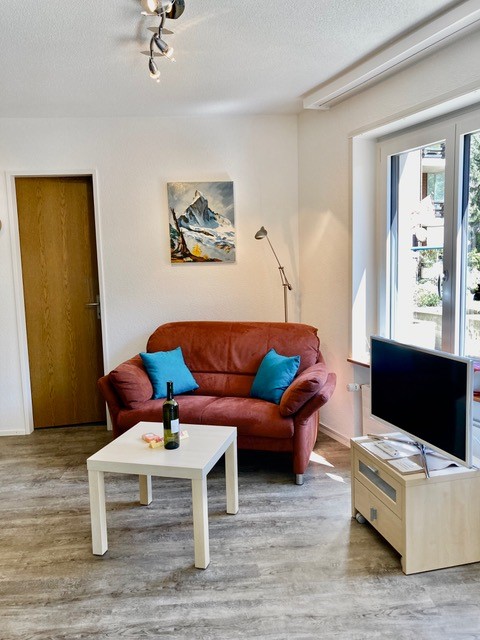 Modern eingerichtetes, helles Studio mit Sicht auf das Dorf Zermatt und die umliegende, fantastische Bergwelt. Das Haus Bodmen B ist an ruhiger Hanglage zentral gelegen, nur 5 Gehminuten zum Herzen von Zermatt sowie zum Bahnhof und zum Ski-Bus.